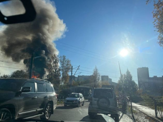 На кадрах с места видно, что над городом возник огромный столб черного дыма. Местные жители наблюдают последствия возгорания из окон.