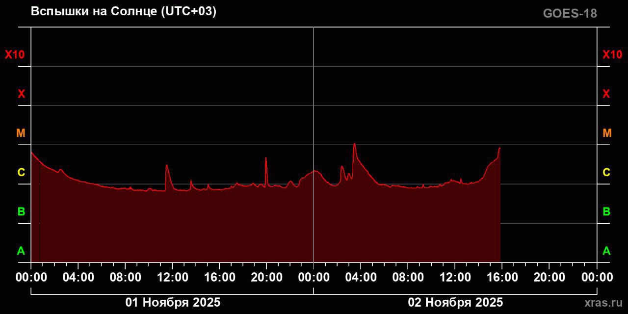 Как сообщает 2 ноября лаборатория солнечной астрономии ИКИ РАН, на Солнце после двухнедельного перерыва возобновились сильные вспышки. Это предвестники длительного всплеска солнечной активности, пик которого придется на следующую неделю с 3 по 9 ноября.