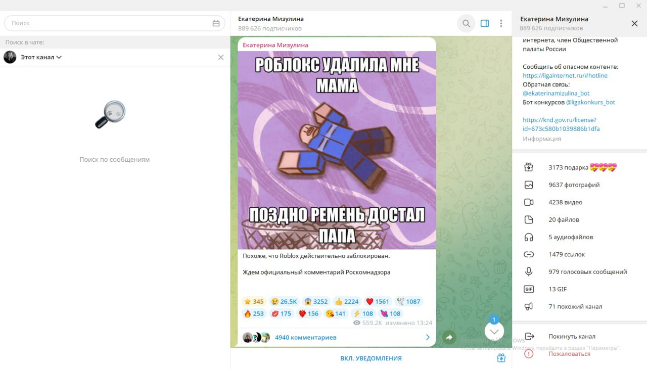 Некоторые успели вложить немаленькие суммы денег в платные функции в игре. Пишут о десятках тысяч. Сама Мизулина в ответ опубликовала мем: "Roblox удалила мне мама, поздно достал ремень папа".