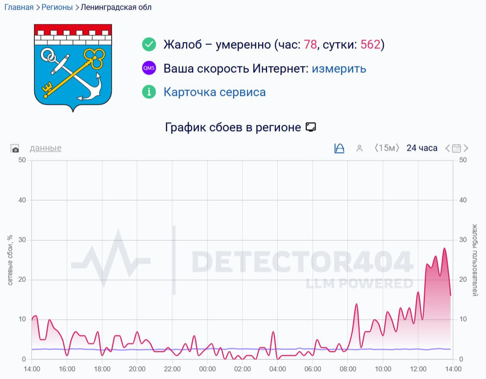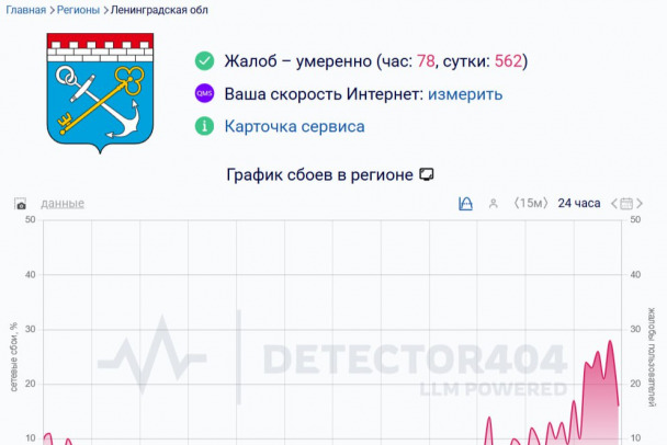 По данным платформы Downdetector, которая отслеживает сбои в работе цифровых платформ, в Ленинградской области сегодня с утра начало расти число жалоб от интернет-пользователей. Всего за сутки пожаловались до 30 тысяч человек. Сообщается, что проблемы есть также в Гатчинском и Лужском районах.