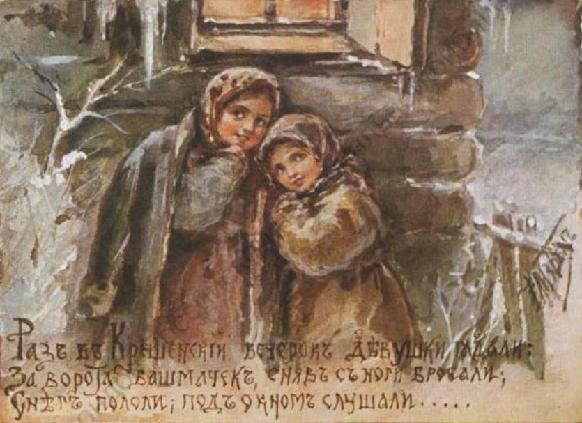 9. На отклик. Еще один вид святочных гаданий, описанный Пушкиным — оклик прохожих. Девушка выходит вечером или ночью на улицу, останавливается около ворот и спрашивает имя первого встретившегося мужчины. Считается, что услышанное имя принадлежит ее будущему мужу.