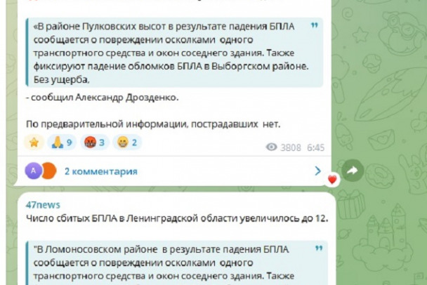 Пулковские высоты были упомянуты губернатором Ленинградской области Александром Дрозденко в одном из сообщений об отражении атак БПЛА. Сообщалось о повреждениях остекления. Через несколько минут пост был отредактирован - в него внесли уточнения о том, что повреждения транспортного средства и окон одного здания были зафиксированы в Ломоносовском районе.